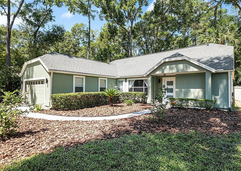 Rarely Available in Southerland Crossings – Designer 4BR/2BA in Haile Plantation Welcome to this beautifully renovated 4-bedroom, 2-bath home tucked into a quiet cul-de-sac in the rarely available Southerland Crossings neighborhood of Haile Plantation. With 1,756 sq ft under air, a split-bedroom floor plan, and a 2-car garage, this home offers both functionality and luxury with extensive upgrades from 2019 to 2025. Step inside and be wowed by the ledger stone wood-burning fireplace, wood laminate floors throughout, and smart home integration featuring a Nest thermostat and Philips Hue smart lighting inside and out. The screened-in patio with PVC deck tiles opens to a fully fenced backyard with lush landscaping — perfect for relaxing or entertaining. The primary suite is a true showstopper. The master bathroom was extensively remodeled in 2024 and features: • Calacatta marble tile flooring • Floor-to-ceiling Calacatta marble accent walls • Floor-to-ceiling wood-grain tile shower walls • Wall-hung solid birch wood vanity with soft-close drawers and hinges • Miami White quartz square-cut countertops • Trough sink with dual Delta Champagne Bronze faucets • Toto wall-hung tankless toilet • Walk-in curb less shower with 72” linear tile drain • Delta Champagne Bronze rain head, dual-head shower column (3 heads total) • Matching Champagne Bronze cabinet hardware and robe hooks Additional upgrades throughout the home include: • New Trane HVAC (2024) with HEPA air filtration and Halo Reme UV air purification • Navien 180-A tankless gas water heater • New insulation (2024) throughout and A/C’d, insulated garage • Kitchen remodel (2019) with Kenmore Elite stainless appliances and granite countertops • GE all-in-one ventless washer/dryer combo • Interior & exterior paint (2024) including fence and doors • All-wood wainscoting, 8” baseboards, upgraded trim, and Venetian plaster finishes Located in the heart of Haile Plantation near walking trails, parks, dining, and top-rated schools, this home blends timeless elegance with modern convenience. Homes in Southerland Crossings rarely come available—don’t miss your chance to own this thoughtfully renovated gem.