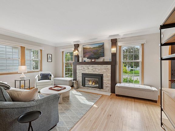 Set on a charming block, the curb appeal impresses immediately with newer siding, windows, and shingles. Inside, the main floor boasts a warm gas fireplace and original oak hardwood floors. The living room flows seamlessly into the dining area and a custom kitchen, remodeled with high-end finishes including quartz countertops, a stylish tiled backsplash, and upgraded appliances—featuring an induction stove.