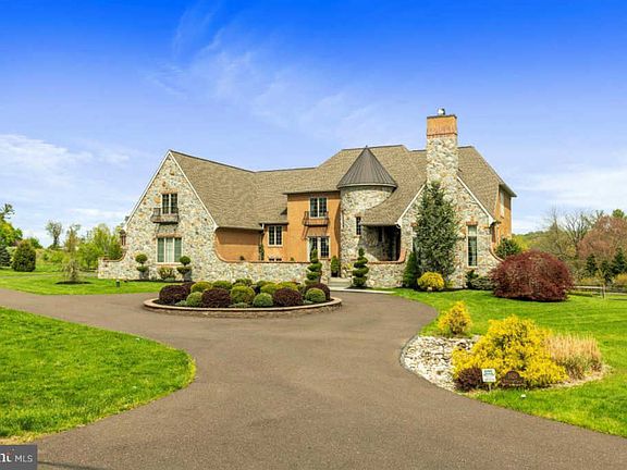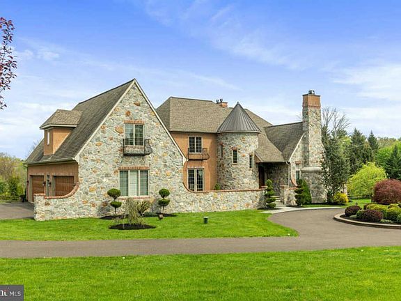 Custom Luxury Home located in Stoneymead, one of the most prestigious neighborhoods in Buckingham Township, Bucks County. Enter this French Tudor complete with turret and rustic alder door, and a courtyard straight out of Tuscany. Once inside the welcoming foyer you will notice the spiral staircase and a French door courtyard walk out in the dining room. The living room has a natural stone 18 ft. fireplace and adjoining study with wet bar. At the heart of the home is the Italian limestone floored kitchen complete with a Bertazzoni 6 burner stove and a large island with exotic quartzite. Next to the kitchen is a breakfast room, a family room separated by a stack stone see-through gas fireplace and access to a large composite deck which over-looks a bucolic gentlemanâs farm. Upstairs there are 5 bedrooms and 4 bathrooms. The master suite has a gas fireplace, deep cast iron tub, large walk-in stack stone shower, 2 dressing rooms and sitting room. The lowest level has a completely finished 2000+ sqft. walk out basement with travertine floors, a 1920âs themed bar inset with an 1841 antique post office, wine cellar/grotto, fitness room, office, pool table area and a full bathroom. The French doors lead out to the bluestone patio with salt-water spa and pool. Built with some of the finest specimen stone countertops and floors, complete with an oversized 4-car garage and whole house generator. Many panoramic views throughout the house on this flat 2.32-acre property with many updates since it was built in 2012.