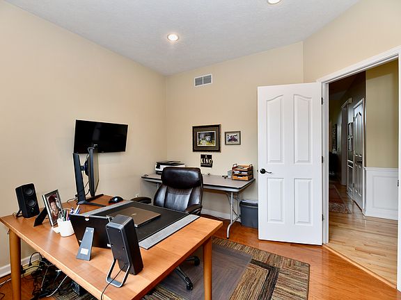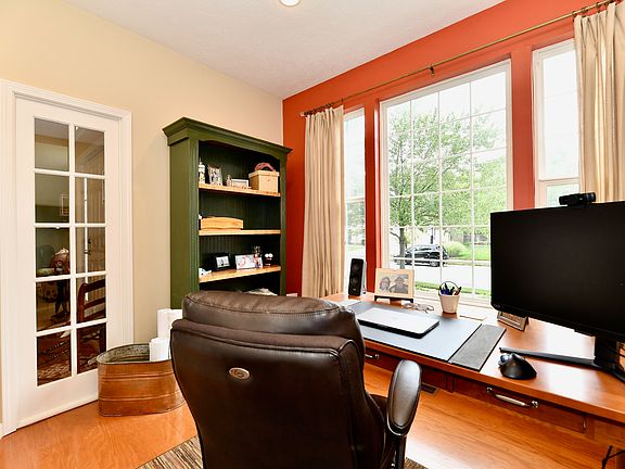 Welcome to this spacious 4-bedroom, 2-full, and 2-half-bath home in desirable Delaware Commons. The moment you step inside, you'll appreciate the newly refinished hardwood floors that grace the main level. The home boasts a spacious two-story family room with a dual-sided fireplace, seamlessly connecting to a bright and airy sunroom-ideal for relaxation or entertaining. The large primary bedroom is a true retreat, featuring an updated shower and a generously sized walk-in closet. Additional highlights include a finished basement with a wet bar, perfect for hosting gatherings, and a private backyard that adjoins a common area, providing tranquility and easy access to walking trails. The home is thoughtfully designed with formal dining and living areas, as well as a separate office space, catering to all your needs. Residents of Delaware Commons enjoy exclusive access to community amenities, including a pool (in Delaware Trace) and walking trails. This home combines modern comfort with a prime location, offering both privacy and community convenience. Don't miss your chance to make this exceptional property your own!
