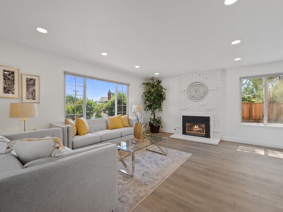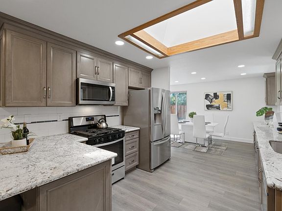 Move right in to this tastefully updated 3 bed 2 bath ranch-style home, situated at the end of a long, quiet cul-de-sac, in a desirable Pleasant Hill location with views of Mt Diablo in the distance. Step into a light-filled living area with luxury vinyl tile flooring, recessed lighting and a cozy fireplace. A welcoming dining area has built-in cabinets with granite countertops. The eat-in kitchen has been newly remodeled with granite counters, stainless-steel appliances and many contemporary cabinets to suit your storage needs. The expansive enclosed sunroom has an abundance of natural light with windows galore! Both bathrooms have been thoughtfully updated with modern vanities, hardware and shower enclosure.