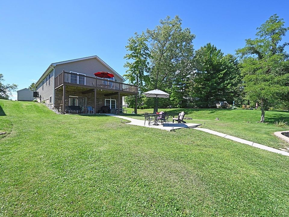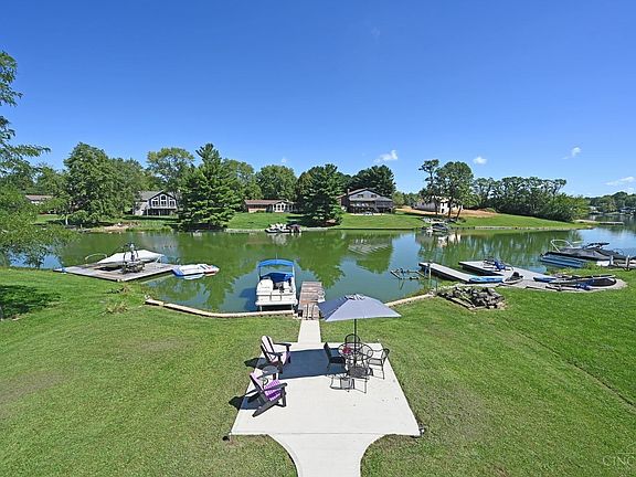 Custom 1owner lake front home on cove w/private dock offers open flr plan-Lg kitchen w/island, dining area & Great Rm. Cathedral ceiling, arched wndw, atrium style drs lead to balcony! Primary bdrm has walk-in closet, adj bath w/shower. Study. 2nd bdrm w/walk in closet. LL boasts FULL Guest Suite w/sep kitchen, laundry & walkout to patio! 2 bdrms, full shower bath, storage, pellet stove! Ext has stone siding, concrete drive, storage shed, sidewalk w/patio at lake, stone paver retaining wall.