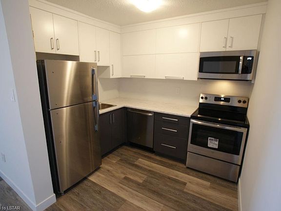 7th floor. Professionally renovated 1 bedroom unit at "Sunrise Condos" with big balcony (gas BBQ's allowed). Custom kitchen and bath. Premium Luxury vinyl tile throughout. Brand new stainless steel appliances. Family friendly neighborhood, surrounded by mature trees, walking distance to all the great shopping at the corner of Oxford and Highbury. Bus stop at your front door. Massive renovations underway in this complex; new windows, patio doors and balcony railings already installed. New hallway flooring, lighting, painting, entryway, lobbies and laundry rooms are in the process of being completed in 573 & 583. See building 563 for the finished look! Property tax is $1098/yr. ALL-INCLUSIVE Condo fee is $313/mth includes heat, hydro, water and one assigned parking space (B-26).