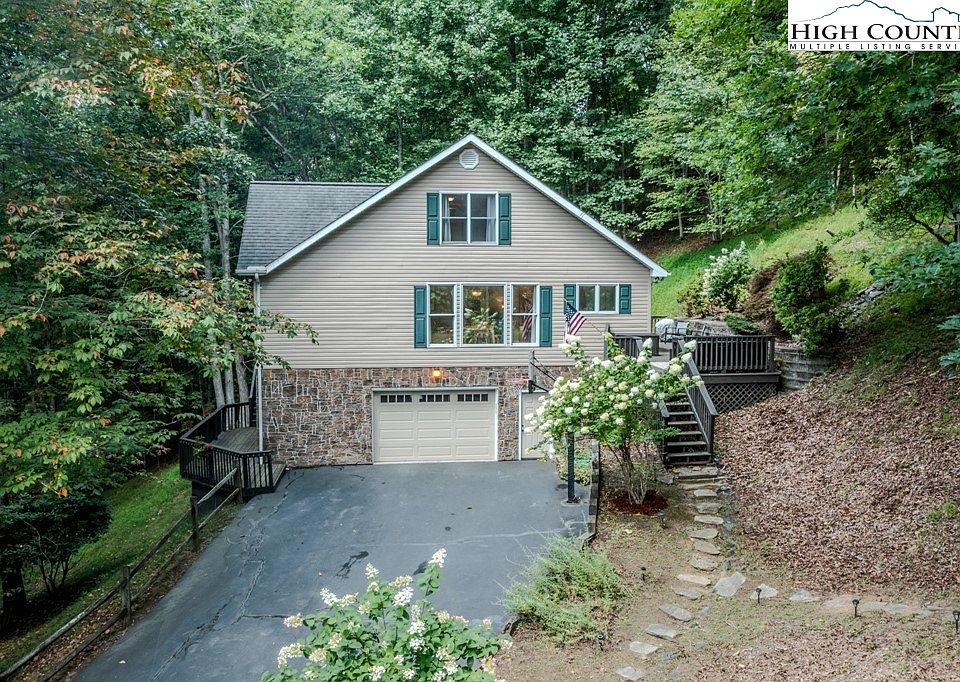 This charming home is ideally situated in the serene Hickory Ridge neighborhood, in the heart of Valle Crucis, offering the ideal blend of tranquility and adventure. With its prime location near the Watauga River, you’ll have easy access to activities like fly fishing, concerts at Valle Crucis Park, shopping at the Mast General Store, and various recreational and biking trails. The open floor plan features floor-to-ceiling windows that provide abundant natural light and a treehouse-like ambiance. The living room seamlessly connects to the dining and kitchen areas, creating an inviting space for gatherings. The home offers three bedrooms and 2.5 baths. The primary suite is spacious with walk-in closets, and a luxurious en-suite bath. Two guest bedrooms and a full bath are conveniently down the hallway. A versatile third level is used as a sleeping area and game room but can be adapted to your needs. The lower level features an entertaining space, a large desk area for crafts or an office, ample storage and a laundry room with a large sink. The oversized garage includes shelving and space for additional activities like a ping pong table. Enjoy the great outdoors on the deck with an outdoor couch, nice for relaxation. The exterior also includes covered and open deck areas great for grilling and entertaining, as well as a cozy fire pit for family and friends. Recent improvements include new hardwood floors in the kitchen in 2023, refinished wood floors in 2023, new flooring in baths and bedroom in 2024, a new refrigerator in 2023, updated deck furniture in 2022 and living room couches in 2024. This home is not only excellent for family living but also holds potential as a rental property, thanks to its convenient location and the array of nearby attractions.