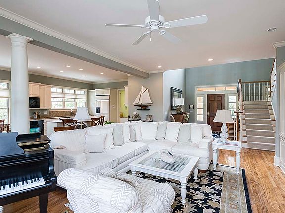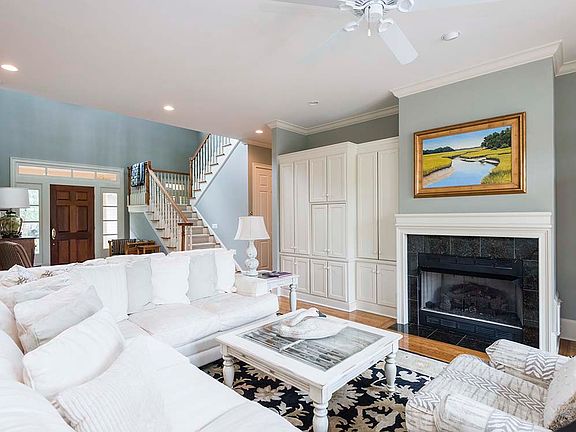 563 Ruddy Duck Court is an ideal family retreat with a two-bedroom guesthouse, fairway views, and a saltwater pool. - On hole no. 5 of the Tom Fazio-designed Osprey Point golf course - Expansive outdoor living spaces with wide golf views - High-ceilinged, open floor plan perfect for entertaining - Two wet bars and an outdoor kitchen - Generously sized homesite of more than half an acre Designed by the architects at Berenyi, the HardiePlank® home at 563 Ruddy Duck Court is nestled on a quiet cul-de-sac. Its wide front porch leads both to the front door and an elevated walkway to the guesthouse. Step inside the two-story foyer with its gallery overlook. Straight ahead the living room, with gas fireplace, showcases the views with a wall of transom glass doors leading to the expansive sundeck. The oak hardwood flooring and crown molding run throughout the main living areas. The living room is open to the sunlit dining room and kitchen with its white cabinetry, beautifully veined granite countertops, center island with breakfast bar and Bosch® cooktop, pantry, and rows of windows inviting natural light inside. To the other side of the dining area is the home's light-filled sunroom. The master suite is also on the main level. In the bedroom, transom glass doors open to the screened porch, and in the bath are his-and-hers sinks, a soaking tub beneath windows, and a walk-in shower. Upstairs is an open library with an angled ceiling, wet bar, and glass door to the second-story balcony. Two guest suites, each with tall plantation-shuttered windows showcasing the views, offer full baths with wide, glass-doored showers. The guesthouse comes with a sitting room with mini-kitchenette and two guest suites, each with large windows overlooking the treetops.