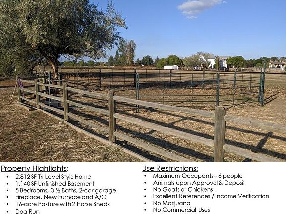 5-bedroom house on 16 acres. 2812 sq ft Tri level style with attached two car garage, 3 bathrooms, 1140sq ft unfinished basement, fireplace and air conditioning. Large heated shop. Located at the corner of Kechter and Tilden. $2500 monthly rent, $2,500 security deposit and pet deposit. Tenant pays all utilities. No marijuana growing on property. No commercial enterprises. Maximum occupants: 6 people, animals upon approval. Must have excellent references and proof of monthly income to qualify (W2s, pay stubs, background check, application fee).