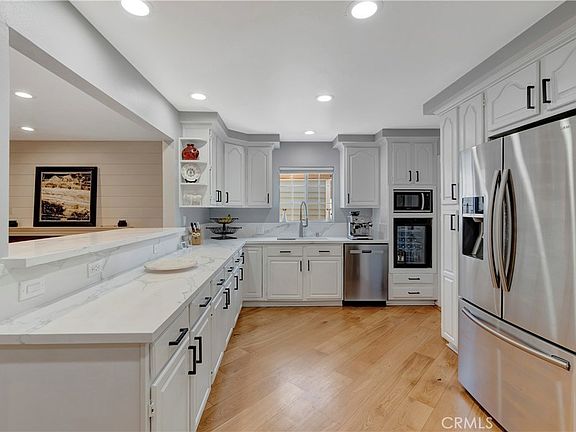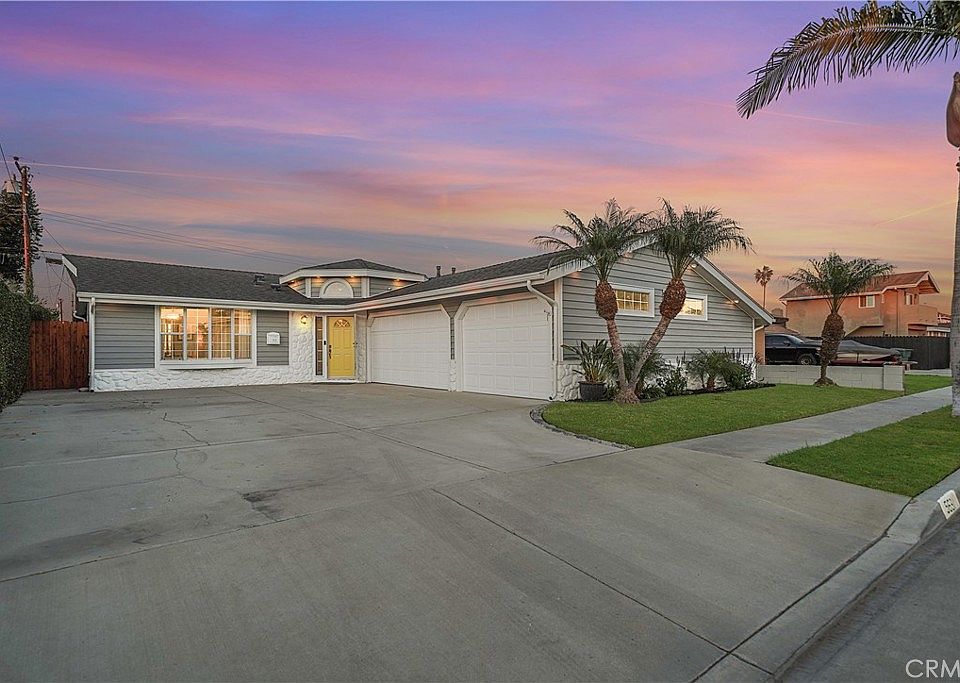 Nestled in a prime interior location on a serene, single-loaded street overlooking a lush green field, this exceptional family home offers nearly 2,100 square feet of single-level living space with an oversized attached three-car garage. Thoughtfully upgraded inside and out, the home boasts refinished hardwood flooring, vaulted ceilings, stylish shiplap accents, custom window coverings, recessed lighting, ceiling fans, and French doors. Modern comforts include a new A/C system, a whole-house fan, a water softener, a tankless water heater, and ample storage. Designed with an open-concept layout, the spacious great room features a cozy fireplace, while the beautifully updated kitchen showcases brand-new countertops, upgraded cabinetry and hardware, a convenient pass-through breakfast bar, a built-in writing desk, and high-end stainless steel appliances. Direct access from the oversized 3 car garage to the kitchen adds ease to daily living. The private primary suite impresses with soaring ceilings, French doors leading to the backyard, a massive walk-in closet, and a spa-like en-suite bath—completely remodeled with dual sinks, a luxurious soaking tub, and a separate walk-in shower. Generously sized secondary bedrooms include one with its own fully remodeled en-suite bathroom. The low-maintenance backyard is an entertainer’s dream, featuring high-quality turf, upgraded hardscaping, a large storage shed, and mature landscaping for added privacy. The expansive driveway provides ample parking space, including room for a boat or RV, with additional storage sheds in the side yard. Enjoy the ultimate in convenience with dining, shopping, and entertainment just a short walk away, as well as the nearby Meadowlark Golf Course. Plus, with easy access to the freeway and just under three miles to the Pacific Ocean, this home truly offers the best of coastal living!