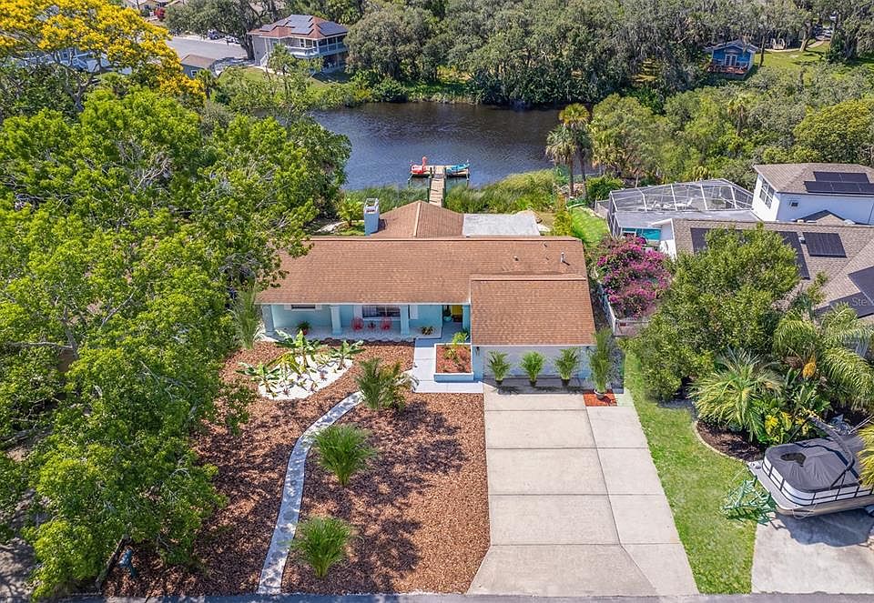 Minutes from the Gulf of Mexico, this Turn-key home or 5-star waterfront Airbnb sits high and dry on the Cotee River with NO flood insurance required, no HOA, an open floor plan and vaulted ceilings with gorgeous water views, plus a floating dock. Watch dolphins and manatees swim by in this peaceful home with a huge kitchen, 3 bedrooms (garage is converted), 2 bathrooms, fireplace, laundry room, and screened-in porch. Prime fishing in your backyard or kayak 5 minutes to the Nature Preserve. Golf cart friendly community. Walk to historic downtown New Port Richey which is quickly becoming known for its restaurants, breweries, live music, and events. 2022 water heater, 2021 Electrical panel, 2018 AC, 2013 roof. Just 45 minutes to Tampa, St. Pete, and Clearwater. Live the dream in this fully-furnished home, or generate income as a turn-key vacation rental that sleeps 8 or more. We can't wait to welcome you home!