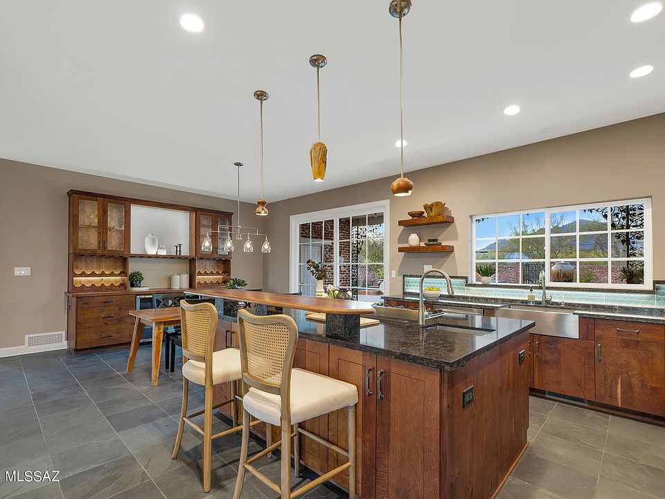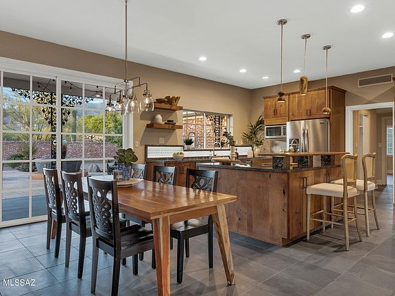 Nestled in the Catalina foothills, this classic home bestows a sense of peace & privacy while every room is infused with light and views. Bring your ideas for a Casita or second garage/workshop. There is plenty of room to expand on this 1.14 acre view lot. The chef's kitchen features mesquite cabinets, Cambria quartz counters & a large island. The dining room is a host's delight with built-in bar. Designed for entertaining, the expansive Great Room provide space for a pool table, large screen TV while creating a seamless flow from other areas so all can enjoy gathering around the fireplace and enjoying the city lights. The generous primary boasts a renovated bath. Seller is licensed AZ real estate agent Two additional large bedrooms share a Jack & Jill bath. All bedrooms & the living room feature bamboo floors while the kitchen, family, dining & powder rooms feature slate floors.