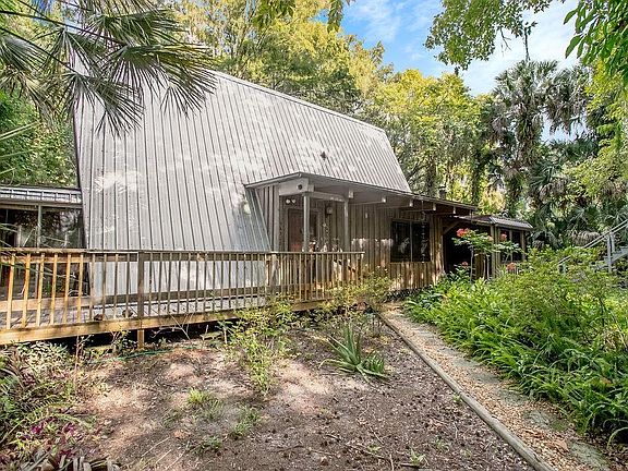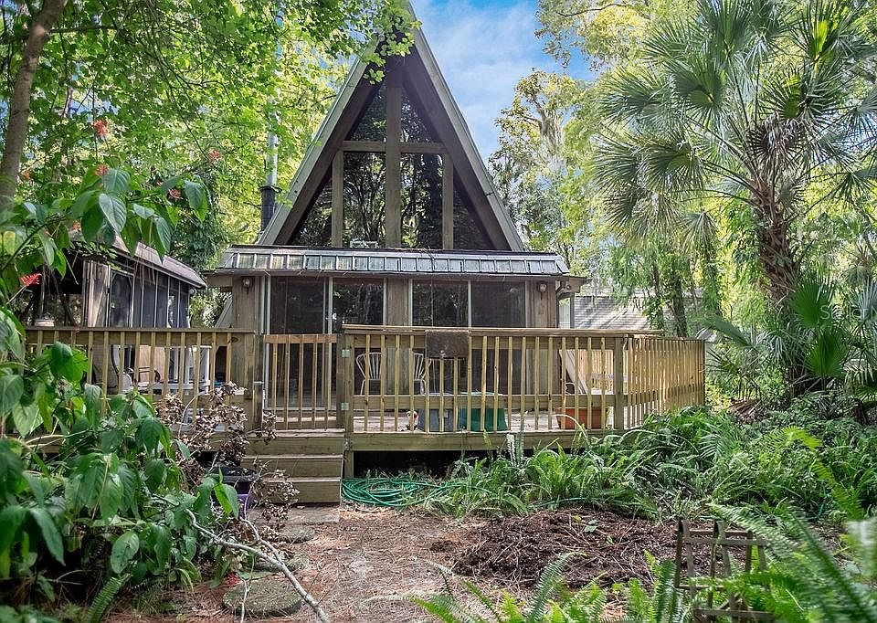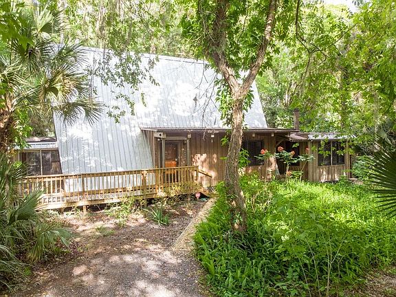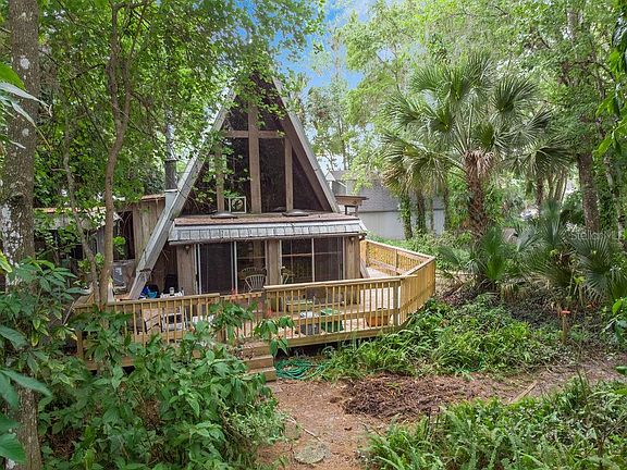 ONCE IN A LIFETIME OPPORTUNITY TO OWN a mountain like retreat with St Johns River access. This one of a kind A-frame home is situated on .67 acres with meandering gardens throughout. This is perfect for the nature lover or the fisherman at heart - hop on your golf cart and take a stroll through the neighborhood where everyone is family. Perfect fisherman's paradise with private community boat ramp and easy access to the river. Home features wrap around deck and a separate 12 x 14 screened porch with built-in BBQ grill - ideal for outdoor dining. New metal roof in 2015 and new HVAC in 2018. Inside you will find high ceilings and a ton of natural light. Kitchen is open to the living room. Lots of built-ins to store your favorite books or china pieces. First floor master, office/parlor and two more bedrooms. Upstairs loft with half bath can be used as guest room or additional master. Detached 1 car garage includes a multi-purpose room above it - perfect for an art studio, hobby room, additional storage or even an office. This is a golf cart friendly community with a private community boat ramp and a low optional HOA of $35 a year. Less than an hour to Daytona, Ormond and a little over an hour to Orlando. If you are looking to withdrawal from the hustle and bustle of life, this unique A-frame Astor beauty is for you!