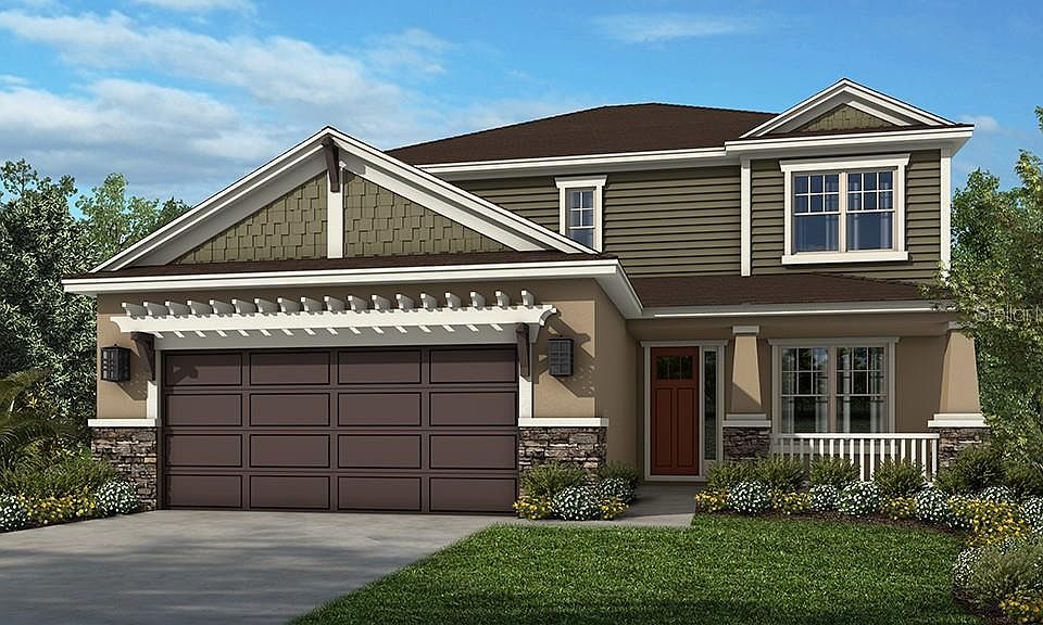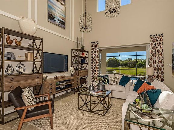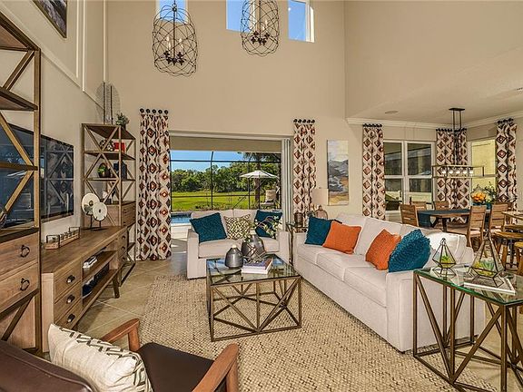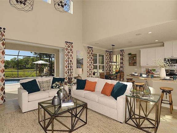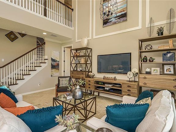 READY NOW!!! This award winning 4BR/3.5BA, 2 story home offers soaring 20' ceilings, an Owner's Suite on the first floor with two walk-in closets, dual vanities, spacious walk-in shower with garden tub and private water closet. Large Kitchen opens to the Gathering Room. Upstairs Loft area, additional bedrooms and study are great for activities. Outdoor entertainment is easy on the 10' X 40' Lanai. Stainless Steel Appliances, Tile Back splash in Kitchen, 42" Uppers in Kitchen with New Haven Maple with Painted Linen Cabinets with under cabinet lighting, Cambria Quartz Summerhill counter tops in Kitchen & Owners Bath and Granite tops in Secondary Baths, 18" Ceramic tile floors throughout except for carpet in Bedrooms, Den & Loft, Interior paint upgrade and much more! Photo is of model, not actual home.
