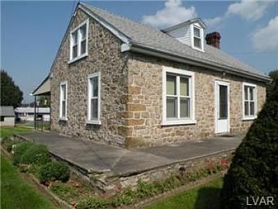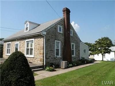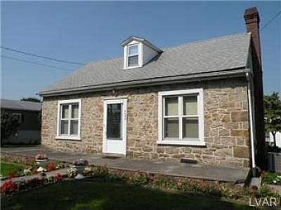A great yard in a great location is what you'll find with this Lower Macungie home. This half acre property is close to all major routes and within walking distance of downtown Macungie, shopping, schools, Macungie Memorial Park, and the library. The stone cape home offers 2 large areas for gathering in the family room and attached living room/dining room , a first floor full bath, kitchen with gas range, and two 2nd floor bedrooms with a gigantic walk-through closet. Buyers should find the updated mechanicals attractive--new oil furnace in 2008, hotwater heater installed in 2004, new well pump installed in February 2011, water softening system, newer roof, and replacement windows. Outside, find a covered porch and 2 substantial outbuildings. A framed, 20x18 building with electricity has 2 rooms and would be ideal for a studio or workshop. A second 25x18 stone block building could be used as a utility shed or an additional workshop. Much potential in this East Penn SD home!
