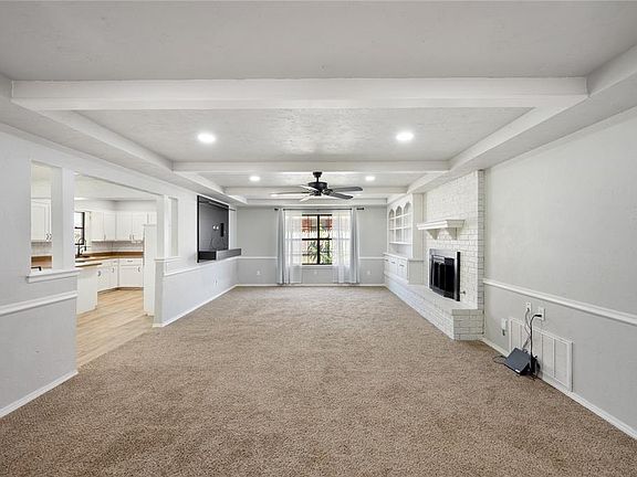 Welcome to Frolich Meadows Estates! This spacious, well-maintained home is ideally located just minutes from Tinker Air Force Base with easy access to Sooner Road. Thoughtfully updated and full of charm, it offers both comfort and convenience in one perfect package. Step inside to a large, light-filled living room featuring recessed lighting, custom built-ins, and a stunning floor-to-ceiling brick fireplace—ideal for cozy nights or entertaining guests. The kitchen boasts rich wood plank porcelain tile, ample counter space, and bar seating, seamlessly connecting to the open dining area for easy flow and function. The private owner’s suite is tucked away from the secondary bedrooms, offering a peaceful retreat with refreshed paint, wood-look tile flooring in the en-suite bath, and an updated walk-in shower. Two additional bedrooms share a well-appointed full bath. Notable upgrades include a new roof in 2025, an in-ground storm shelter, an extended driveway, and a backyard storage shed perfect for tools, hobbies, or extra storage. The covered patio and spacious backyard make outdoor living enjoyable year-round. This home offers it all—space, style, and smart updates. Don’t miss the opportunity to make it yours. Welcome home!