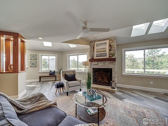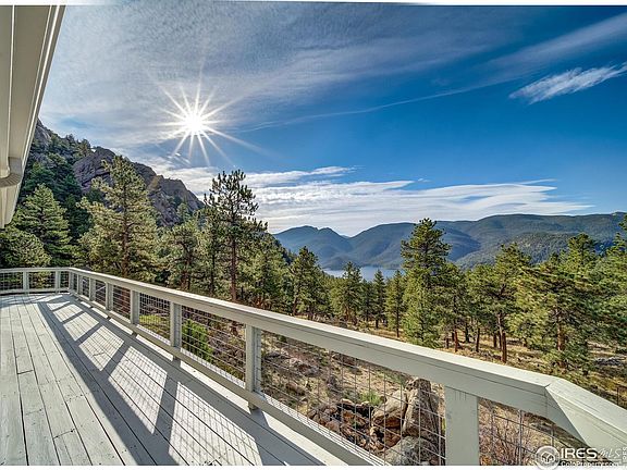 Nestled inside Buttonrock Preserve behind a locked gate, this is one of thirteen private parcels, located approximately 20 minutes from Lyons. The conveniences of town are nearby but the sense of wilderness and privacy at this property are rare and wonderful. The parcel is 40 acres and bordered by National Forest and Buttonrock Preserve. The rolling property is one of evergreen forest, granite outcrops and stunning views of Ralph Price Reservoir, Indian Peaks, Longs Peak and Mount Meeker. Fishing is popular in the North Saint Vrain River as well as with a special permit in the Reservoir. Built in 1999 and completely remodeled in 2019, the house has state of the art windows and heating, hand forged wood burning fireplace, stone and tile flooring, cherry cabinets and top end bathroom and kitchen finishes. The main level has a large open kitchen with all Bosch appliances, an island and lots of counter and storage space. The dining area has large windows and views and opens to a wraparound deck. The living room has a gas fireplace, great light and views and deck access. Two bedrooms with en-suite bathrooms, a powder room, and a laundry complete the main level. A modern glass sided stairway allows for light and views to access the master suite. The large bedroom opens to a private partially covered deck for year-round enjoyment. The views are spectacular and not a single neighbor is visible. The walk out lower level has a family room with a wood fireplace, an office with extra storage and the utility room. The attached garage has ample room for two cars and a work-space.