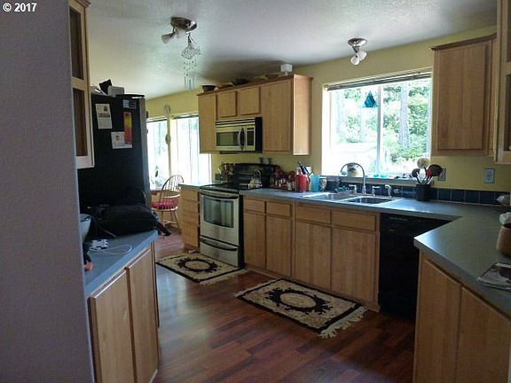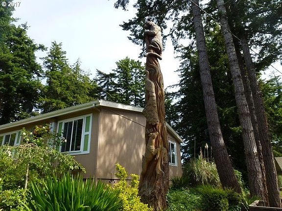 Wonderful location in the country, yet close in! Easy access to Hwy 101, close to beach, boat ramp, State Park & Bandon Dunes golfing. Must see GORGEOUS, HUGE PRIVATE back yard with composite decking front & back. Unique 25' wildlife 'totem pole'! Great open floor plan is light & bright w/ cozy gas stove. Kitchen features stainless appliances, pantry, & eating nook. DR w/slider to back deck & yard w/fire pit area.