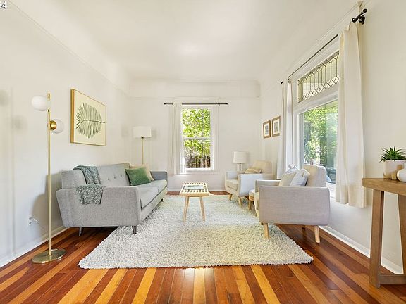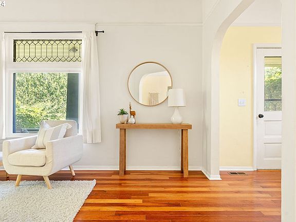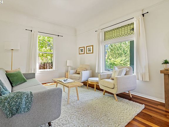 Perched high up off the street on a lush corner lot, this attractive and private Overlook bungalow has classic vintage sensibilities in a desirable location. The entryway provides a welcome landing to lace up your shoes and leash up your pup. Gorgeous wood floors lead you through curved doorways to tall ceilings and a large, romantic leaded window. A dedicated formal dining room is an inviting social hub for big dinner parties, while the spacious kitchen has generous cabinet storage, a cool kitchen island, and a timeless aesthetic. The adorable kitchen breakfast nook is a fun perk for casual meals or a card game. Two bedrooms and a full bath round out the main. Downstairs, there's a large bedroom with 2 closets and an egress window, full bath, laundry room, den, and a wet bar - valuable living space with lots of opportunity for rental income, out-of-town guests, co-habitation, or game and movie nights with your buddies. Both front and back yards are easy maintenance for busy lifestyles while leaving plenty of space to garden &/or utilitize the goat pen on the north side yard. And who doesn't love a big front porch for summer people watching or sipping a cup o' joe in the morning? The newer clean and functional detached garage was built in 2009 and is ideal for a studio, workshop, office, secure parking or build out your <insert dream here>! Such a convenient North Portland location--public transportation, MAX, yoga, coffee, food, beer, parks, schools. And bonus: it's close to Portland Community College, ensuring that this home has very intriguing rental income potential. [Home Energy Score = 6. HES Report at https://rpt.greenbuildingregistry.com/hes/OR10186278]