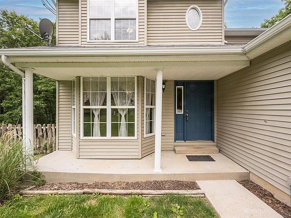 Charming 3 bedroom two-Story home nestled on 2.71+- private acres of wooded paradise! Enjoy the tranquility of the natural setting of the huge yards from the covered front porch or back deck. The entry opens to the living room area with bay window and woodburning fireplace and joins the dining area. A spacious country kitchen provides ample cabinetry, huge pantry and all appliances stay! A wooden staircase takes you Upstairs are 3 generous size bedrooms and updated bathrooms, with the primary bedroom having vaulted ceiling and walk-in closet. The walkout lower level adds more living space with a rec room and lots of storage. Don't miss this opportunity! For convenience, the property is being sold "as is".