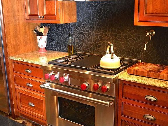 Fabulous kitchen with natural cherry inset cabinetry, granite countertops w/ogee edge, travertine backsplash, huge island with undermounted prep sink, large Kohler apronfront sink, 36" SS Thermador Professional Series gas range w/conv oven and wall hood, built in SS refrigerator/freezer, Bosch DW, SS Thermador microwave oven/convection oven unit, built in SS icemaker, pot filler, plantation shutters, hardwood/tile floors, limestone counters in master bath with travertine floor/shower 2 showers