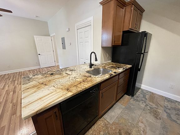 This first floor apartment was recently fully remodeled with hardwood throughout, tall ceilings, new windows, and in-unit laundry. The kitchen has Barbados Sand granite countertops, a peninsula that looks out to the living room, track lights, garbage disposal, and black appliances including dishwasher, built in microwave, gas stove, and full size refrigerator. The bedroom has a walk in closet, washer & dryer, and access to the full bathroom with ceramic tile around the tub. The covered front porch is for this unit. Landlord pays water, sewage, and trash disposal. Tenant pays gas & electric.