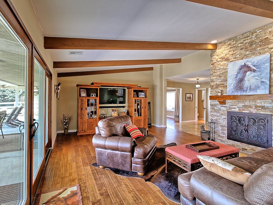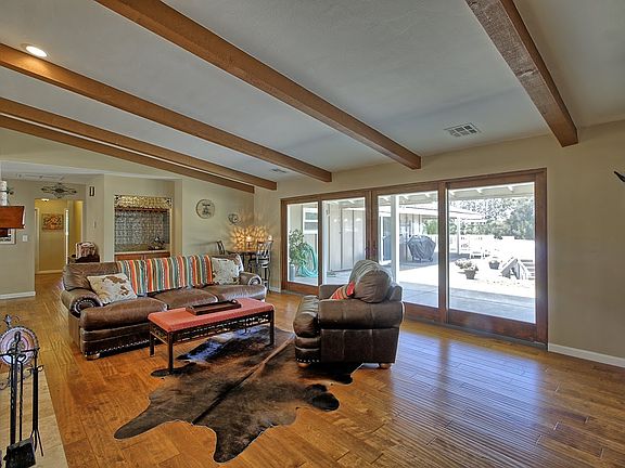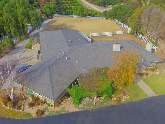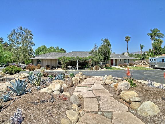 Absolutely stunning horse property! This 5 bedroom, 3.5 bath home with 3764 square feet is gorgeous from the inside out! Complete with a 125x125 riding arena, 5 horse stalls, wash rack, power and water to horse area/arena, barn lights, automatic water to every stall, tack room with power. Native, drought resistant landscaping and a long driveway lead to the beautiful ranch style home. Incredible interior design details including a living room with vaulted, exposed wood beam ceilings and floor-to-ceiling windows/sliders that take you to the expansive yard. A stacked stone fireplace is featured as well, along with a bar that features aluminum backsplash against stained wood. The chef's kitchen is truly five-star, with custom details such as stainless steel appliances, granite counters, wood cabinets, recessed/pendant lighting, a large center island with seating and a great flow to the huge formal dining room with views out to the backyard. The master suite is exquisite and has an en suite bath with marble counters, a separate vanity with seating, huge walk-in closet with wood floors, and offers a large deck for enjoying the tranquility of the surroundings. All of the bedrooms are incredibly spacious with built-ins, huge windows, tons of storage/closet space and the bathrooms are beautiful and totally updated. RV / horse trailer parking. Fenced yard for dogs and animals. Goat / small animal pen with automatic water system. Central AC. Separate laundry room with tons of storage space, sink and tile flooring. New energy efficient windows and sliders in the entire home. Updated electrical. New hardwood floors and travertine tile throughout. You cannot miss out on this home, and it will go fast. Extraordinary and so special. Schedule a showing with REX today!