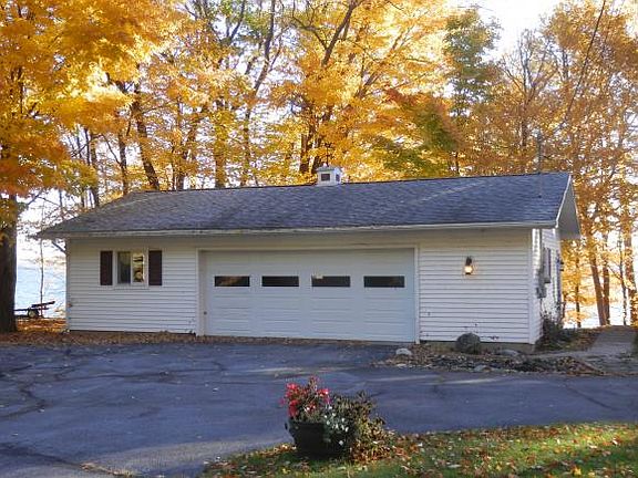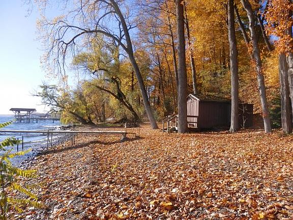 Exceptional property! Beautiful picturesque setting has bordering stream and easy walking path to 219' of private shale beach. This 2 bedroom, 2 bath ranch home has a bright spacious living area w/cathedral ceiling & hardwood floors. Eat-in kitchen has sliding glass door leading to the large lake side deck where you'll enjoy spanning lake views. Both bedrooms are large & the MBR has master bath & walk-in closet. Full walk-out basement can be finished for additional living space. Over-sized (24' x 39') detached 2+car garage offers plenty of storage or ideal space for a workshop. Lake side stora