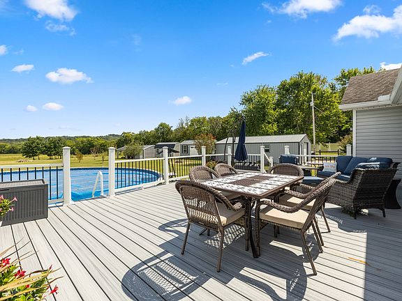 This property is a little piece of Heaven w/gorgeous views of the hills front & back! Beautiful 3 bdrm, 2 bath home on 5 acre mini-farm to include detached garage/shop, implement bldg w/storage area, and newer above-ground 33' pool (two storage bldgs do NOT remain). Home has new luxury vinyl plank throughout, fresh paint (excl 1 bdrm), freshly painted kitchen cabinets & granite counters w/all kit appl to remain; converted 2-car gar is the perfect mancave w/gas heat & window A/C unit. Owner Suite has attached wall headboard to remain & beautiful barn door to full bath w/dbl sinks, combo tub/shower & lg walk-in closet. Enjoy maintenance-free rails & trex decking on the lg deck while relaxing by the pool! Or, watch the sunsets on your peaceful front porch!