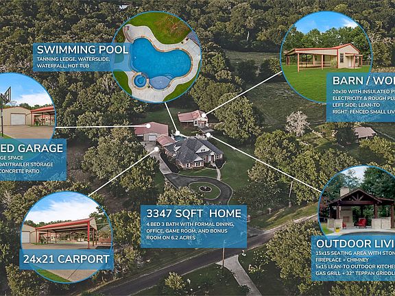 Over 6 acres with a pool, outdoor kitchen, workshop, and bonus spaces — this Texas retreat blends country living with modern comfort. Summers are made easy with a custom pool featuring a slide and heating option, plus a workshop (~600 sq. ft.) that’s insulated and plumbed for a bathroom — a true blank canvas ready to become a pool house, guest suite, gym, or hobby retreat. The outdoor kitchen with fireplace sets the stage for gatherings year-round. Inside, all 4 bedrooms are conveniently located on the main floor. In addition to the main living area, there’s a flexible downstairs room that could serve as a formal living space or private office, plus a cozy breakfast nook and a separate dining room — perfect for holiday gatherings with family and friends. Upstairs, you’ll find one large open space that’s ideal for a pool table, media setup, or game room, along with a bonus room that could serve as a craft room, office, or even an extra bedroom. The kitchen features a gas cooktop, and the home is supported by three HVAC units and two propane tanks for efficiency and peace of mind. Function meets practicality with an oversized laundry room featuring a sink, cabinets, and countertop workspace, conveniently located off the carport entry. Parking and storage are no issue with a detached two-car carport, detached garage (~860 sq. ft.), and additional storage for a boat, RZR, or other toys. Bring the kids, pets, and all your gear — there’s room for it all. Located between Edgewood and Canton Texas, famous for First Monday Trade Days, you’ll enjoy small-town charm, a welcoming community, and easy access to Dallas for work, shopping, and entertainment. Don’t miss the chance to make this property your own. Schedule a showing today and explore the possibilities. Info is deemed reliable but not guaranteed. Buyer and or buyer's agent shall be responsible for verifying all information including but not limited to square footage, utilities, easements, restrictions, schools, etc.