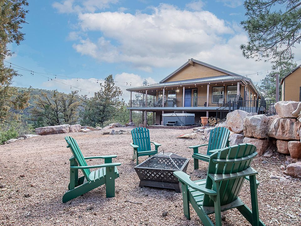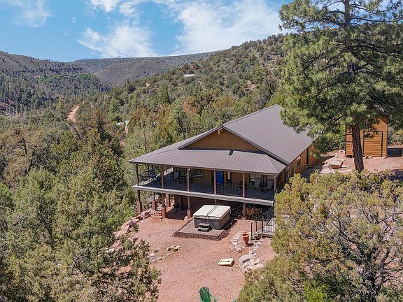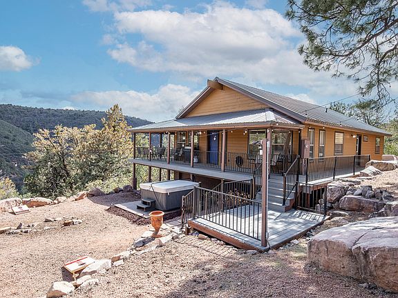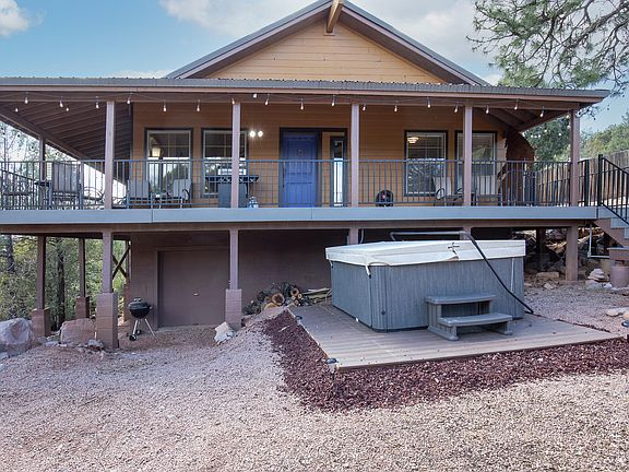 Turnkey FULLY FURNISHED 3 bed + den, 2 ba home nestled in the pines in Payson! Open concept living space features cozy fireplace and airy vaulted ceilings. Kitchen w/ plenty of cabinet space, breakfast bar, and ALL APPLIANCES INCLUDED! Master suite exits to the deck and offers a walk-in closet and en suite bath with shower & jetted soaking tub. Generously sized secondary bedrooms, guest bath, and den currently set up as a bunk room. Enjoy STUNNING mountain/ forest views from the wrap around deck or relax in the hot tub under the stars. Upgraded windows, composite decking, detached workshop, and ATV garage under the home. Great location near creek, hiking trails, ATV trails, perfect for year round living or to escape the Valley heat!