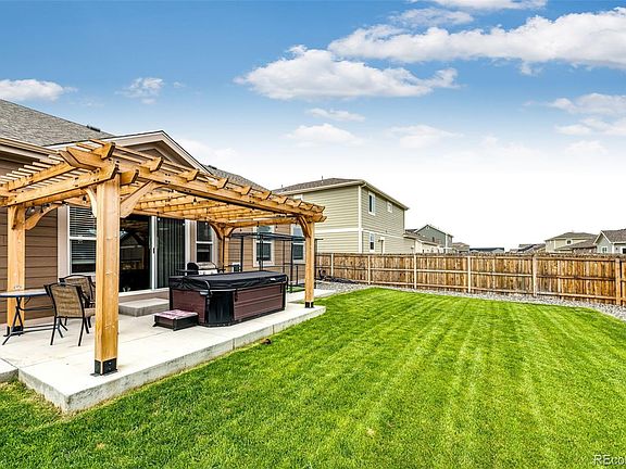 Stunning, well cared for, nearly new move-in ready home waiting for its new family! Three bedroom, two bath, Ranch Style home with a two-car oversized tandem garage that could easily fit four cars or two vehicles, toys, bikes, mowers, etc.; as you walk into this beautiful home from the covered front porch, you will see a bright living room that flows into the dining room and kitchen with a lovely South facing window that your plants are sure to love! Quickly access the laundry room/mudroom located off the garage. The bedrooms are a split scenario, with the primary bedroom on one side of the home and the other two on the opposite. Finish the full unfinished basement to your liking. The backyard has a privacy fence, a landscaped yard with a sprinkler system, a pergola on the extended concrete patio with sidewalk access to the garage, and a kennel with a dog door from the living room. Sit in the included hot tub and enjoy! This home is only a 20-minute drive to the Metro area and 25 minutes to DIA; schedule your showing today!