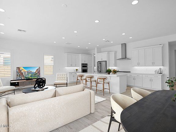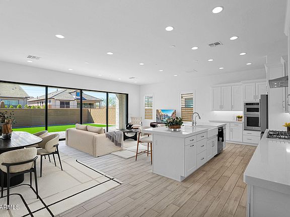 Arizona living at its finest! Nearly new and beautifully upgraded farmhouse-style home in Mesa's prestigious Reserve at Red Rock gated community. Built in 2023 and backing to a desert common area, this single-level beauty combines designer style with a functional layout. Enter through the elegant iron front door to an open concept split floor plan featuring 10 foot ceilings, 8 foot doors, custom shutters on all windows, and wood look tile throughout the entire home. The timeless chef's kitchen showcases white shaker style cabinets, quartz countertops, subway tile backsplash, stainless Kitchenaid gas appliances, undermount lighting, and a large island with apron style sink. Natural light floods the space through a 20-foot multi-slide glass door, creating a seamless flow between the interior and the beautifully designed backyard which offers low-maintenance artificial turf and pavered patio spaces. The spacious primary suite is located at the back of the home and includes an ensuite bathroom with a freestanding tub, frameless glass shower, floating vanities with double sinks, and a roomy walk-in closet. Additional highlights include modern finishes, rectangular sinks in all bathrooms, brushed nickel hardware and faucets, a large laundry room with an abundance of cabinets and a built-in sink, and pavers at the driveway and front porch.