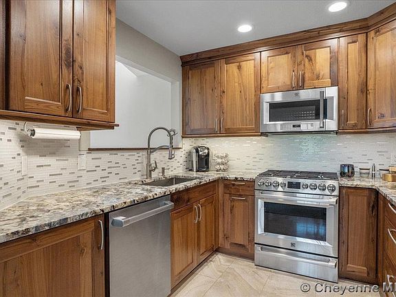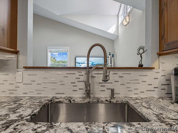 Prepare to be enchanted by this beautiful home updated throughout and located on a huge lot at the top of a cul de sac in north Cheyenne! The inviting natural stone entry with gorgeous walnut accents on the custom handrails, stairs and posts compliment the brushed nickel balusters. Once upstairs enjoy the plush carpet in the open living room, which looks out over the huge yard in the back! The sliding doors in the dining room not only add so much light but lead you out to the roomy deck! The kitchen is stunning with its natural stone floor, beautiful granite and custom walnut Pinnacle cabinets. The stainless appliances are a pro series work of art! The hardware and the back splash compliment the beauty of this bright kitchen. The 2 full bathrooms share the custom cabinetry and granite finishes featured In the kitchen and are beautiful and functional. The charming half bath downstairs is Convenient and lends privacy to the master suite. The upstairs bedrooms are sunny with large closets and the master suite downstairs is a must see! It has all the beauty and functionality you could want or need with a huge closet. The daylight windows in the lower level add charm and warmth to the wonderful family room spacious enough for everyone to enjoy. Don’t miss seeing this beautiful home!!! There is nothing to do but move in and enjoy!