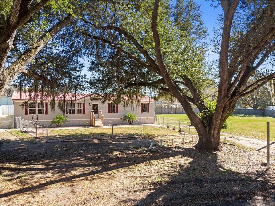 This beautifully updated manufactured home is immaculate and move-in-ready! Featuring a fantastic split floor plan, this home has 3 bedrooms, 2 bathrooms, and a room off of the living area that would make an excellent office, sitting room, or nursery. As you enter the home, you are welcomed by a large living room with crown molding. You will love the wood-plank style, waterproof vinyl flooring that is found here and throughout the home. The kitchen is very clean and open, with lots of cabinet and counter space, an attractive back-splash, and appliances included. There is an eat-in dinette area and also a formal dining room. The master en-suite is very comfortable, with a nicely updated bathroom featuring a huge walk-in tiled shower. Storage is ample in this home, with excellent closet space throughout. There is also an interior laundry room, with washer and dryer included. This home is situated on a large, shaded, fenced-in lot, plus a SEPARATE VACANT LOT. The total land included in this sale is 0.55 acres, and there is NO HOA! This property has plenty of space for parking and storage, with a HUGE over-sized 28x24 carport that will fit 4 vehicles and a large storage shed, as well. Lovingly maintained and meticulously cared for, this home has a metal roof, fencing that was installed in 2016, a tank-less water heater, and an A/C system that is still under warranty! This lovely Southeast Lakeland home provides affordable country living, while remaining close to all you need.