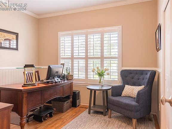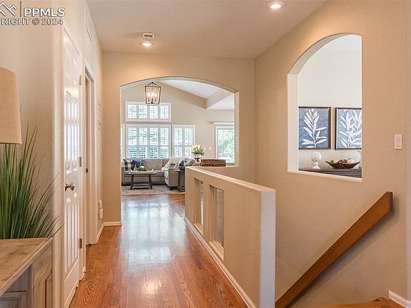 Discover modern elegance & effortless living in this impeccably designed, ranch-style residence located in a prime neighborhood. Spanning approximately 3,328 square feet on a 0.15-acre lot, this home features a sleek architectural design with high ceilings, expansive windows, (silent floor) hardwood flooring & plantation shutters throughout the main level. The upgraded kitchen is a chef's delight w/ stainless steel appliances, ample cabinetry, pantry and Cambria quartz countertops, flowing seamlessly into an open-concept living and dining area perfect for entertaining or everyday use. Four bedrooms, including a luxurious master suite with a spa-like ensuite bathroom, complement the layout, along with two additional bathrooms throughout the home. The basement offers engineered wood flooring designed for durability, a wet bar & additional family room for added entertainment, & massive storage space - along w/ extra storage in the three-car tandem garage. Outside, enjoy a minimal maintenance backyard complete w/ a serene water feature, outdoor speakers, extra electrical outlets and a large patio space ideal for peace & relaxation. Security is paramount with a fiberglass security door & impenetrable safety glass at the front entrance, radon mitigation system already installed, while two French drains in the back thwart any flooding concerns. Additional features include a high lift garage door for convenience, extra overhead space & extra security, award winning D-20 school district, new class 4 impact resistant roof shingles, whole house humidifier & easy access to Powers corridor, I-25, & shopping: Walmart, Home Depot, & Shops @ Briargate for example. Also enjoy Wolf Ranch amenities such as Westcreek Park, Recreation Center & Pool, and Wolf Lake. This home offers a perfect blend of luxury & functionality - and access & privacy - promising a lifestyle of comfort and sophistication. Schedule your private tour today to experience all this remarkable property has to offer.