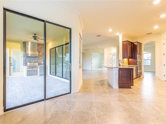 - Interior Features: Ceiling Fans(s), Split Bedroom, Crown Molding, Walk-In Closet(s), Window Treatments, Open Floorplan, Solid Surface Counters, Solid Wood Cabinets, Kitchen/Family Room Combo, Stone Counters, Tray Ceiling(s), Thermostat, Pest Guard System