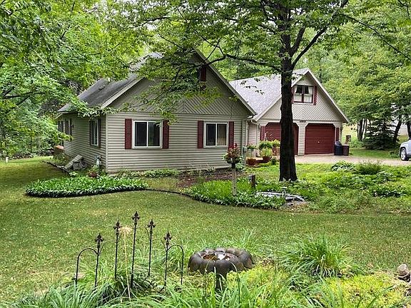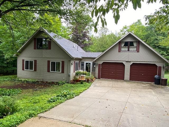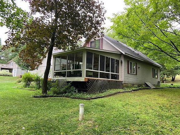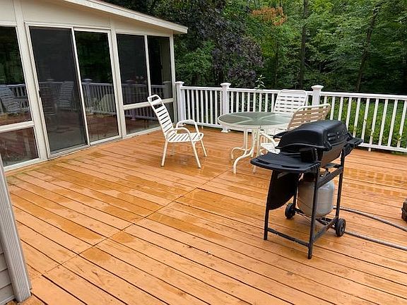 Modified Chalet in wooded setting with stream running behind. Two bedrooms each level, bath each lever-upper is 3/4 with shower. Combination kitchen, dining & living room Interior features Western red Cedar planking, gas log fireplace. 3 season rear sun porch is 16x14 and not calculated in sq footage. small 4th bedroom or den with laundry in closet. Plenty of interior storage. Attached 24x28 garage with full loft for storage. Rear deck. True gardeners dream w/many perennials & Natural landscaping. Newer roof (complete teardown) and newer deck topping & vinyl railings. Blacktop & concrete drive