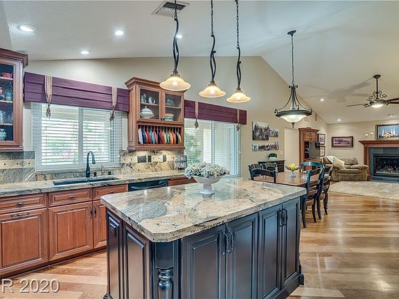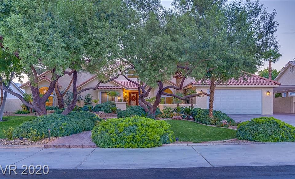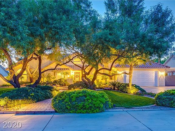 Upgraded Custom Estate on 1/2 acre in Northwest Las Vegas. Enjoy the tranquil beauty of the lush landscape as you walk up the paved pathway to the front courtyard. The home opens to a large great room with views of a resort-like backyard with fountain, pool with cabana; two covered patios, beautifully landscaped including lemon, lime, peach, pomegranate trees, and more along with a garden area. The kitchen is perfect for cooking and entertaining with a large island, custom cherry cabinets, granite, double ovens, and a huge walk-in pantry. The first family room boasts vaulted ceilings, a fireplace, built-in bookcase. The second family room with french doors to the backyard with built-in cabinets, featuring surround sound making this the perfect space for a theater room. Large primary bedroom with a connecting room for an office/exercise room. The backyard has a large grassy area, a play area with a trampoline, and a swing set: RV Parking, No HOA. Lots of upgrades.