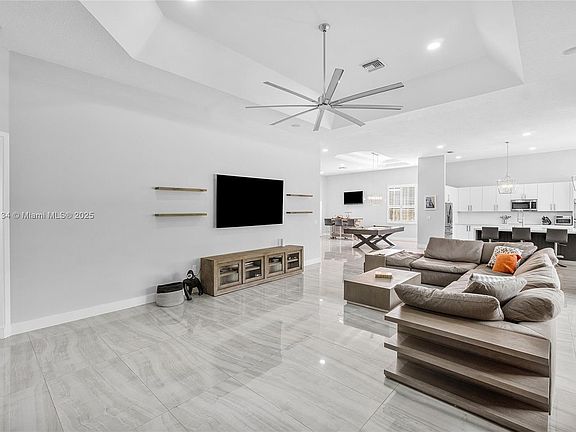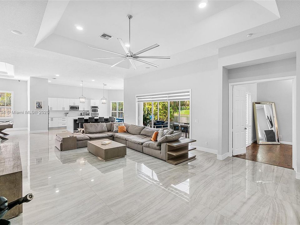 Spacious 4400+ sq ft Builder's model home! This stunning 4 bed Ranch style home offers luxury, privacy and a beautiful backyard oasis.Open floor plan with modern tile floors and a large primary suite with dual vanity sinks, oversized shower, sleek stand alone bathtub and a huge walk-in closet featuring built ins. Full Accordion hurricane storm shutters LED lighting, Custom Plantation shutters, upgraded kitchen with waterfall quartz countertops and newer GE appliances, double oven, wine cooler, Samsung smart fridge. Pool newly 2024 resurfaced with marble deck and summer kitchen. Modern pergola is perfect for entertaining! Front bay window den is perfect for a home office, flex space with built in cabinetry. 3 car garage! Volume ceilings, tons of natural sunlight. Make everyday a vacation!