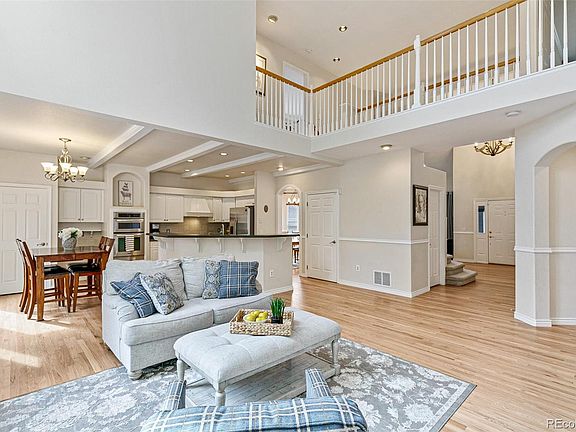 This stunning and beautifully maintained 5 bedroom, 4 bath home with a main floor primary suite, is a MUST SEE. On the main floor, the living room is just off the grand entrance and staircase. Traditional dining room and family room are located just off the kitchen for easy transition. The newly refinished hardwood floors are gorgeous throughout the main living space. The primary suite consists of a very large his and her vanities, shower with separate large tub, and walk in closet. Outside, a new Trex deck, overlooking the plush back yard is plenty of room for play time. This home offers a charming front porch, perfect for morning coffee or evening tea and is located in Cherry Creek School District. Located in a cul-de-sac, this bright beauty features a 3-car garage, storage shed, granite countertops, stainless steel appliances, Fiber Internet, new red oak floors, ceiling beams, crown molding - AND a fruitful Peach Tree. The finished basement boasts a guest room and bath, entertainment space, full bar and plenty of space for entertaining. Seize this GEM now!