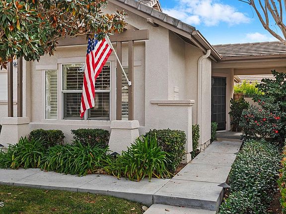 Welcome to Casa Flores, a 55+ gated community in East Simi Valley! This beautiful 2-bedroom, 2.5-bath home boasts great curb appeal and is move-in ready. The spacious primary bedroom suite features a large walk-in closet, and throughout the home, you'll find plantation window shutters. The open floor plan offers more space on the first floor than any other single-level model. The home is adorned with engineered wood plank flooring, while carpeting is found in the second bedroom. Enjoy the low-maintenance backyard patio, which includes a retractable awning, remote-controlled lighting, lovely rose bushes, and a built-in stainless steel gas barbecue! The kitchen is equipped with ample cabinetry for extra storage, a breakfast bar, a gas stove with an oven, a built-in microwave, and a refrigerator. The living room features soaring cathedral ceilings, adding to its spacious feel. Additional features include a two-car attached garage with a garage door opener and built-in cabinets, as well as an indoor laundry room with a washer and dryer. The HOA dues cover amenities such as a pool, spa, picnic tables, a private community park, common area landscaping, front yard landscaping, roof maintenance, exterior painting, insurance, and earthquake insurance. Experience senior living at its best!