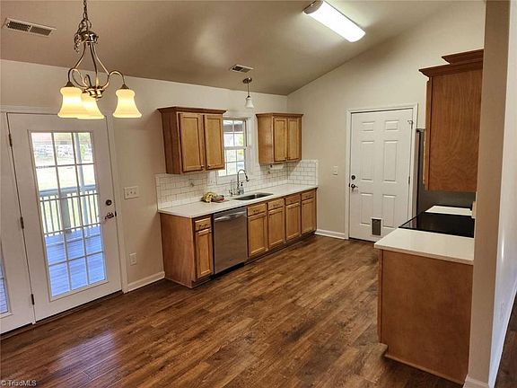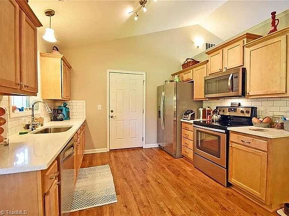 One level living with welcoming covered front porch. 3 BR/ 2 BA open floor plan with cathedral ceilings. 36" Doorways, Fireplace in LR. Kitchen with subway tile backsplash, quartz countertops and SS appliances. Master suite features walk-in closet, double vanity sinks and large shower. Large laundry room with shelving and drying bar. Large screened back porch with ceiling fans, partial trex decking addition with ramp walkout, ideal outdoor entertaining space. additional uncovered deck space, Fenced backyard, quality outdoor shed. .49 Acre lot Charming Bethania area.