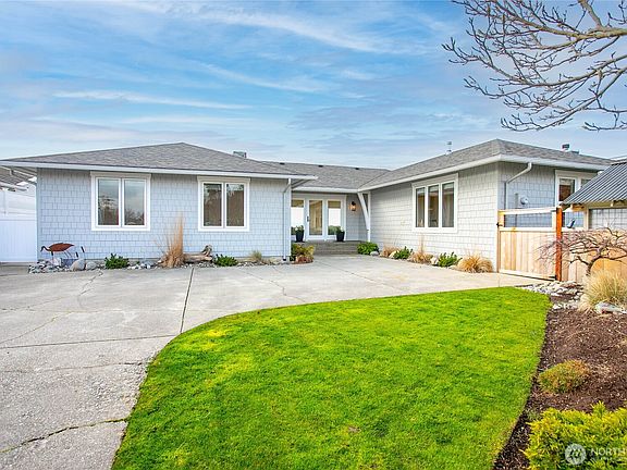 Enjoy 75' of no-bank beachfront living nestled on the exclusive & lower Nakat Way in BBV. This stunning single-story waterfront home was meticulously renovated from the walls out in 2023 w/premium materials. Open-concept layout w/wide-plank wood floors, quartz countertops, a bright, airy interior, multiple living spaces, euro style windows & AC. Unwind indoors or out while soaking in unobstructed 180-degree views of the bay, islands, & mountains. Step onto the beach from your backyard or take advantage of top-tier community amenities: private marina, golf, pickleball, & more. Featuring a beachside patio, outdoor cooking area & shower, this rare offering is one of only eight homes on this coveted street, embodying the ultimate PNW lifestyle.