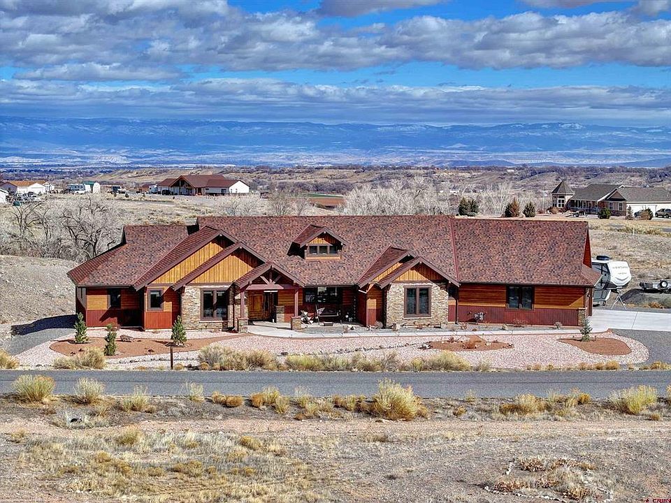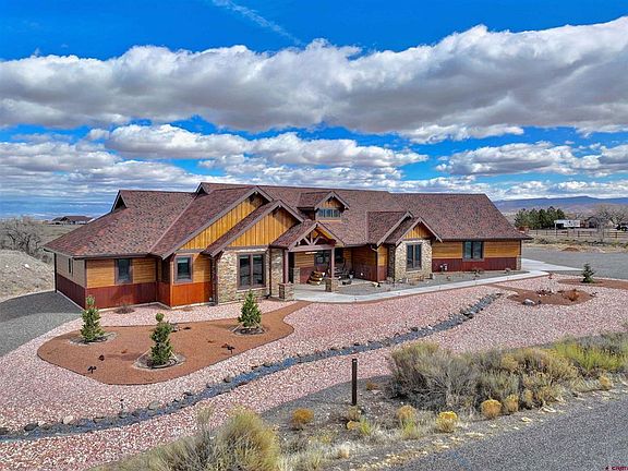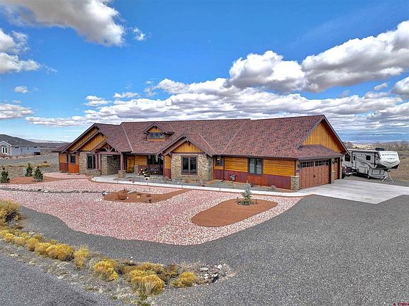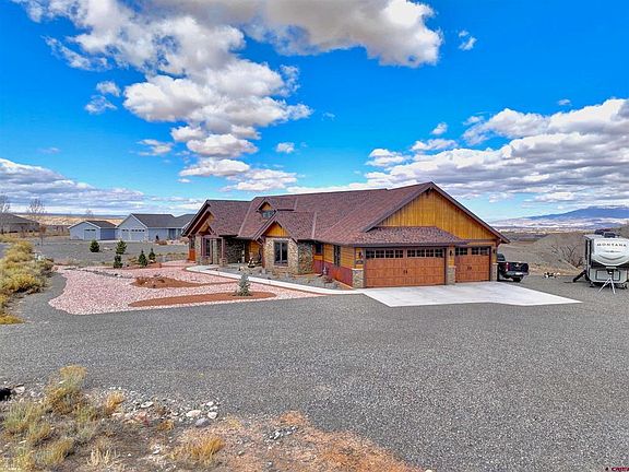 This magnificent custom home is set on top of Sky View Mesa. The panoramic views are majestic and 360 degrees. Upon entering this home you'll notice the stunning Brazilian pecan floors and the gorgeous open design of the cathedral ceiling, the tall arch windows and the spectacular fireplace will take your breath away. The rock wall fireplace is floor to ceiling and the metal gas fireplace will warm the entire room. The rich wood beams continue to enhance the mountain chalet feel. The kitchen is perfect for any gathering. The island has 2" think granite with a sink and plenty of space. The 36" Z-Line range/oven is perfect for a chef or a novice. There is additional counter space and a second sink with views of the San Juan Mountains. The easy flow and design comes with a large pantry. The cabinets and trim are all custom with knotty alder. You'll love the oversized drawers. The Lower cabinets have pull out drawers, which makes quick and easy access to your pots and pans. The floor plan has the 2nd and 3rd bedroom split away from the Master. The second guest bedroom has its own 1/2 bathroom and the third bedroom are privately located on this side of the home. From the garage you enter the mud room area and don't forget to check out the huge inside storage room. The full bath is conveniently located from the garage and the two bedrooms as well as the kitchen. The large office is perfect for anyone needing workspace. The beautiful Master bedroom is located on the other side of the home with a fantastic bathroom and walk in closet. Check out the separate bathroom vanities. The laundry room can be accessed from the walk in closet or the hallway. This home has zero steps and the hallways are 42" wide, while the interior doors are 36". The windows are double pane and wood trim with aluminum cladding. The oversized garage (950+sf) will accomodate any large pickup truck and the 8' tall doors make entering a snap. There is a great rear covered patio with vistas of the valley and the Grand Mesa. The large RV area has a 20/30/50 amp plug with water and sewer hook-ups. The front and rear have been zero-scaped landscaping for low maintenance. Only minutes from downtown Montrose, but far enough away to have a country feel. Elevate fiber optics is scheduled to be completed this year.This is a zero step home, no steps anywhere! The front yard is xeriscaped and the remaining landscape is low maintenance. Elevate internet is now available. The Home has been fitted with a new Radon System. The shingles will be replaced in the next two months (Factory recall). Be sure to check out the video. This gorgeous home will exceed your expectations. Buyer's contingency didn't go through, thius we are back on the market.
