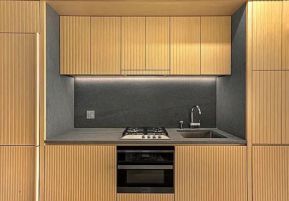 Upon entering the residence, a gracious foyer with dual closets leads to an elegant, custom designed kitchen with solid fluted white oak cabinets, Balsatina lavastone countertops, and Zucchetti fixtures. Fully integrated, state-of-the-art Miele appliances including a 24-inch four-burner gas cooktop, speed oven, refrigerator, freezer, and dishwasher.