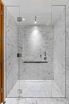 The bathroom features Calacatta marble slab walls and a custom designed floating white oak vanity. The residence is also complete with a washer and dryer, and a multi-zoned heating and air conditioning system.