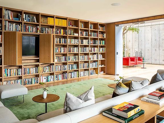 Elegant interior lounge with 92' ceilings, library, and wet bar