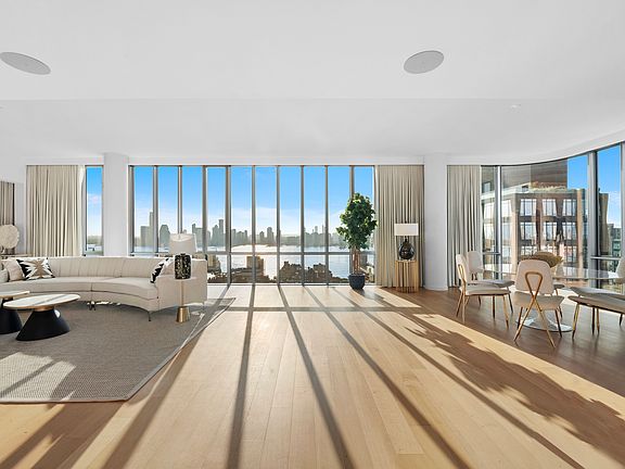 Your primary suite was combined with an adjacent bedroom creating an oversized sitting area with wrap around views from Tribeca to Hudson Yards. An ensuite bath is larger than many bedrooms and has floor to ceiling wraparound windows. A large walk-in closet is generously proportioned.