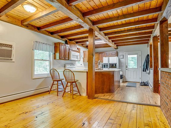 Back on market due to buyer not being able to secure easement they wanted on neighboring land, call agent for more details! Imagine waking up to coffee on your wrap-around farmers porch each day, watching the wildlife run through the front lawn as they pass into your back 7 acres to start their daily adventures. This home has some lovely charm and great features that are sure to please many! Enter through the kitchen and notice the open feeling with the post and beam design and tall ceilings in the family room that opens to the upstairs loft. The floor to ceiling brick chimney is a statement piece that is sure to attract many and is currently servicing the main floor and basement pellet stoves and the boiler for heating. The dining room is bright and the pine flooring really brings out the character of the home. One bedroom, a half bath, and den with porch access finish out the main floor. The second floor features a large loft area with sliding door just begging for a new deck to be added. The primary bedroom is spacious and comfortable, with a second bedroom and full bathroom finish out the second floor. The basement is unfinished with full walk out access, many updated systems, and plenty of space for further expansion. Are you looking for some extra land for exploring, hunting, or sports? Well, the nicely laid out 7.1 acres of land has it all for you! Some area already cleared and the remaining wooded, the possibilities are endless! RV Electric and water.
