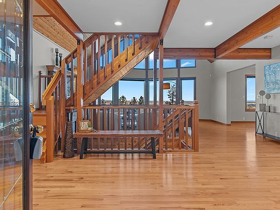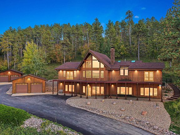 Nestled amidst the stunning landscapes of the Mountain Plains Subdivision in Spearfish, this exquisite and elegantly designed post and beam style home spans an impressive 4,464 SQFT. and sits on a serene and private 4.09-acre lot, offering the perfect haven. With 6 spacious bedrooms, providing ample room for your family or guests, and 3 opulent bathrooms adorned with high-end finishes, you'll experience the utmost in comfort and relaxation. Its not just one but two oversized 2-stall detached garages, are equipped with electric heat and floor drains. On chilly evenings, indulge in the ultimate comfort as you cozy up by one of the two inviting fireplaces, located in both the family and living rooms. Additional features include Bluepeak high-speed internet connectivity, a new snowflake railing, a new deck at the entrance, a new dog run, new roller shades on the main level, and soon, a new roof, and new gutters. The panoramic views encompass Orman Dam, Crow Peak, Lookout Mountain, and the Wyoming Spearfish lights, making the nightscapes truly breathtaking. The backyard offers exceptional privacy, and you'll have easy access to forest service trails right at the top of the development as well as a city park and disc golf course. This property boasts untapped potential as an exceptional short-term rental investment. Don't miss this once-in-a-lifetime opportunity . Listed by Jeffery Christians, Real Broker LLC, 605-920-0425.