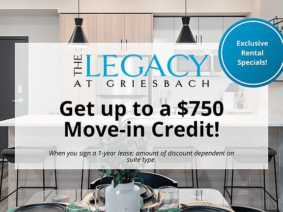 Don't Pay Rent Until 2026!Move in today & don't pay rent until January 1st, 2026!Some restrictions may apply. Speak to your leasing agent for details.Get up to a $750 MOVE-IN CREDIT!Conveniently LocatedThe Legacy at Griesbach is in the charming and vibrant Griesbach neighbourhood in north Edmonton.