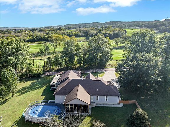 Move-in ready, custom ranch overlooking Pevely Golf Course with - 2000 sq ft of garage space! Features a 3+ car garage on the main level PLUS additional 3+ car workshop below. There's also an RV parking pad and plenty of space for guests or golf carts. Dynamic curb appeal with picturesque views. Its masonry and ornate front door invite you into this majestic estate. Surrounding the front foyer are a formal dining room and gorgeous office. High-end wood flooring, elegant trim casing, coffered ceilings and a classic style reflect the pride of ownership! The kitchen includes a large center island, beautiful cabinetry, and s/s appliances. Open great room with fireplace and built-ins will charm you. Large master suite offers custom closet and deluxe bath with a double vanity and jetted tub. Relaxing sun porch, large, fenced lot and pool are just a few of the bonus features. The finished lower level includes a rec room, bedroom, bonus room, full bath, and huge storage area! Don't miss out! Additional Rooms: Sun Room